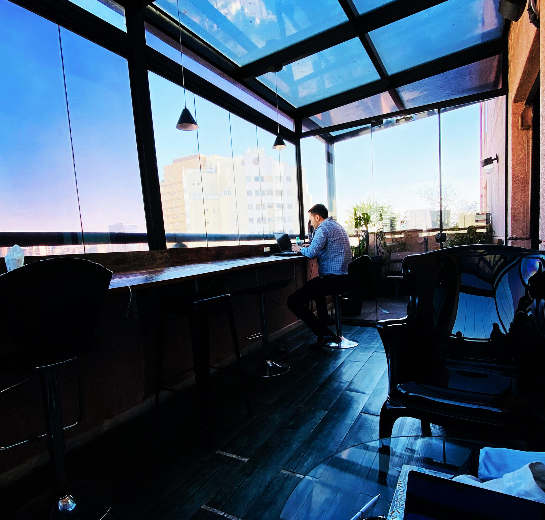 Um ambiente gostoso. Para trabalhar. Descansar do trabalho. Tomar um café. Almoçar. Fazer um happy hour. Assistir ao pôr do sol.
